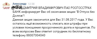 10.01.2018 ВТ… прислал мне СМС, что согласен на реструктуризацию долга под 18% на 10 лет, прощает все мои просроченные платежи и готов предоставить полугодовую отсрочку, лишь бы я образумился и начал выплачивать кредит. Кстати о подобных методах не раз мне писал и РГ… банк. Но… я уже не распоряжаюсь деньгами и финансами, все идет через финансового управляющего.